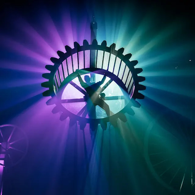 Mika n'a pas fait les choses à moitié en proposant une scène spectaculaire en référence à Charlie Chaplin avec des rouages ou il interprète les chansons comme "Modern Times" et "Spinning Out" aux dessus de la scenes en tournant.